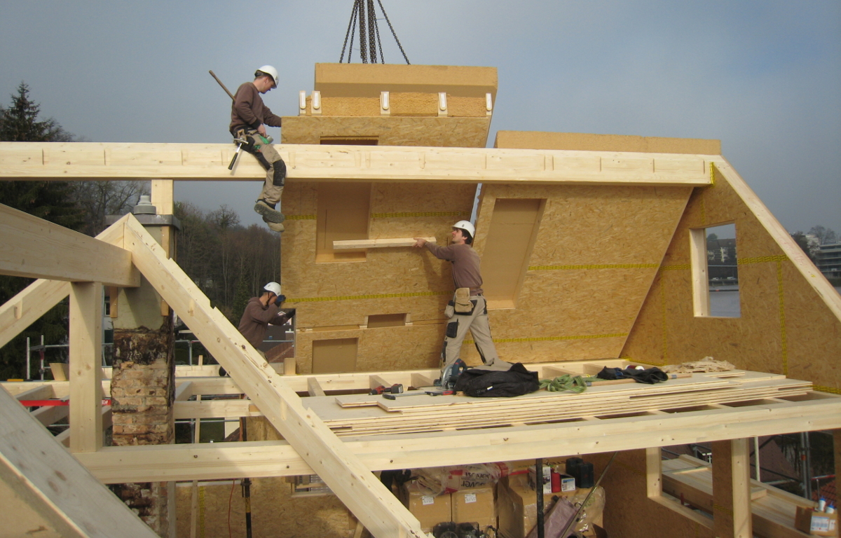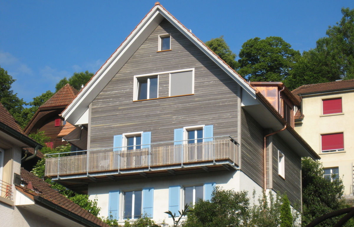 Abbruch und Neubau Dachgeschoss mit 3 zusätzlichen Zimmern und Balkon. Hohe Anforderungen an Schutz gegen Aussenlärm, Komfortlüftungsanlage. Photovoltaikanlage zur Stromerzeugung und für die Warmwasserproduktion.