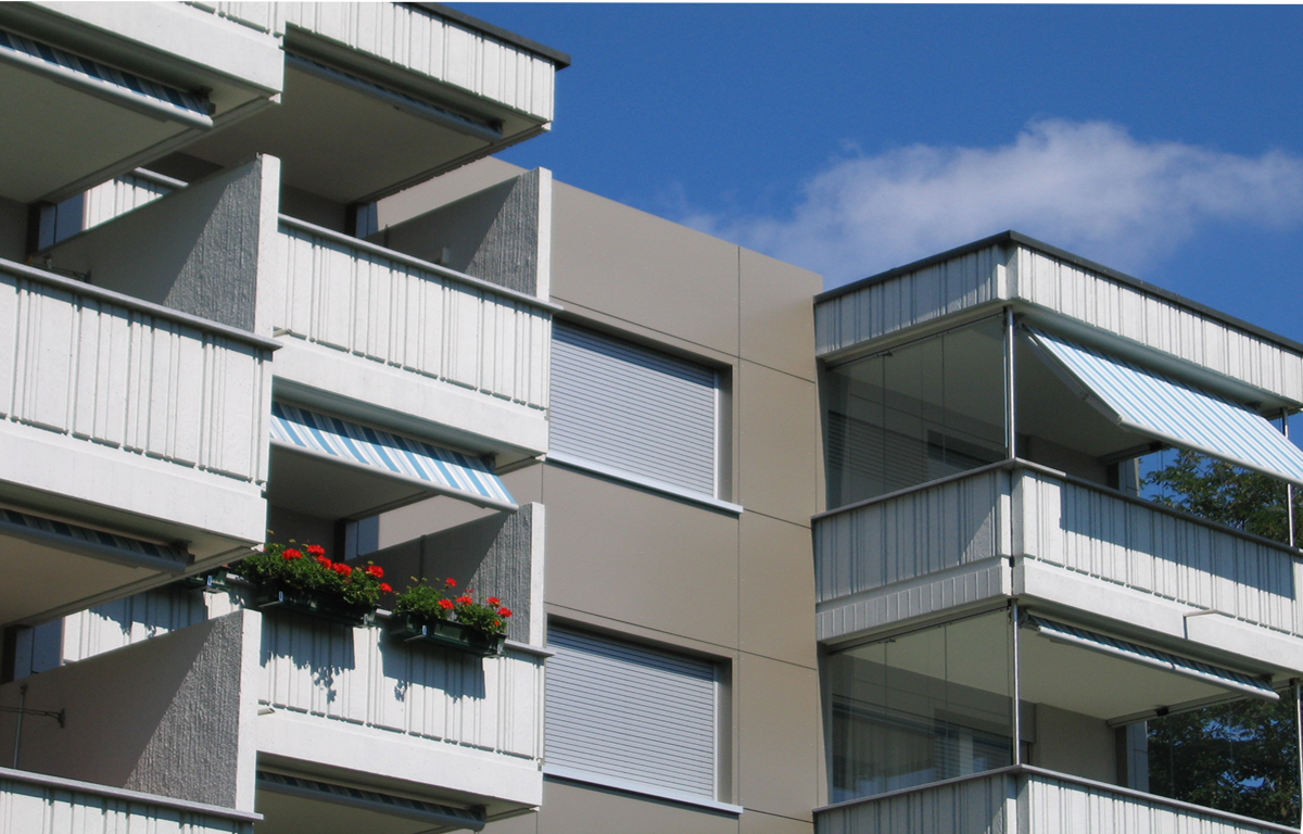 Wohnhaus mit 40 Wohnungen, Totalsanierung in vermietetem Zustand. Auslöser der Fassadensanierung war der schlechte Zustand des Fassadenputzes. Anstelle einer Putzsanierung wurde die Fassade gedämmt und mit einer hinterlüfteten Verkleidung versehen.