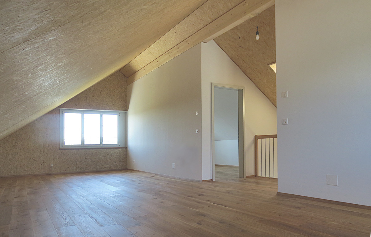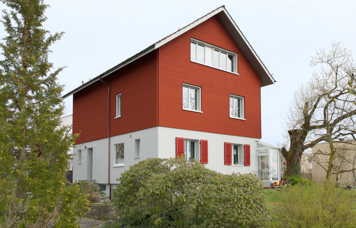 Ein kleines Einfamilienhaus aus den 1950-er Jahren wird in Holzelementbauweise um eine Etage erweitert und mit einer neuen Gebäudehülle versehen. Das Gebäude bietet nun viel ansprechenden Raum für eine Familie und entspricht hohen energetischen Standards.